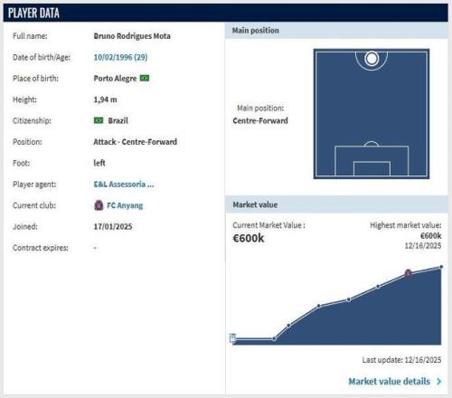 现年29岁的巴西前锋莫塔2025赛季加盟K联赛球队安养队,本赛季总共代表球队出战37场,攻进14球并送出3次助攻,进球数与朱玟奎并列射手榜第4。德转的最新信息显示,莫塔的身价仅为60万欧,仅为拉唐身价的五分之一。