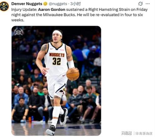 NBA今天公布了两则伤病消息……头一则,掘金队的阿隆 - 戈登,右腿筋“伤上加伤”,又要开启4 - 6周的“养伤假期”!这赛季,戈登的右腿筋就像个调皮鬼老是出问题,这已经是他第二次“搞事情”了。上回戈登缺席,还是在11月呢,当时他直接“躺平”了19场比赛。这次就算乐观估计,休养一个月就能“满血复活”,可等他回来,NBA常规赛都进入最后一个月“倒计时”啦!