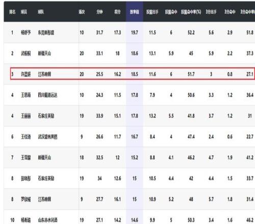 在本土球员篮板榜上,许晨妍以场均抢到6.9个篮板排名第一。在本土球员效率值榜上,杨舒予以19.7排名第一,武桐桐18.6位居第二,许晨妍18.5排名第三,王思雨和王丽丽都是17.8并列第四。很显然,许晨妍是本赛季效率值最高的中锋。相比之下,陈明伶效率值13.7排名本土球员第14位。刘禹彤效率值13.2排名本土球员第16位。
